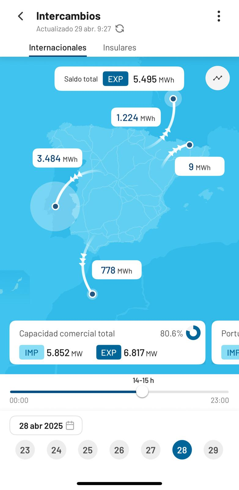 El gráfico refleja las salidas –exportaciones– de electricidad en pleno corte para todos los españoles. Y es que el sistema está programado para mantener su contratos de suministro y lo hizo en pleno apagón nacional. España, por lo tanto, exportó electricidad a Marruecos, Francia y Portugal en pleno apagón general, tal y como refleja el gráfico de "intercambios internacionales".