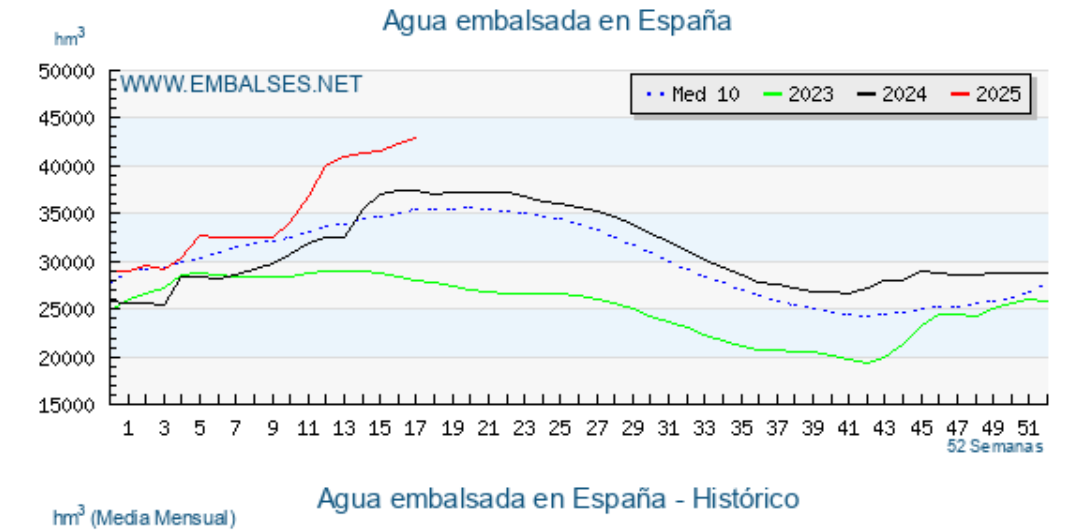 Sea como fuere, "hemos tenido mucha suerte porque teníamos los embalses llenos. Si no, hubiera costado mucho más salir del apagón" añade. En el siguiente gráfico se observan los buenos datos de agua embalsada de lo que llevamos de año por semanas y su comparativa con los dos años anteriores.