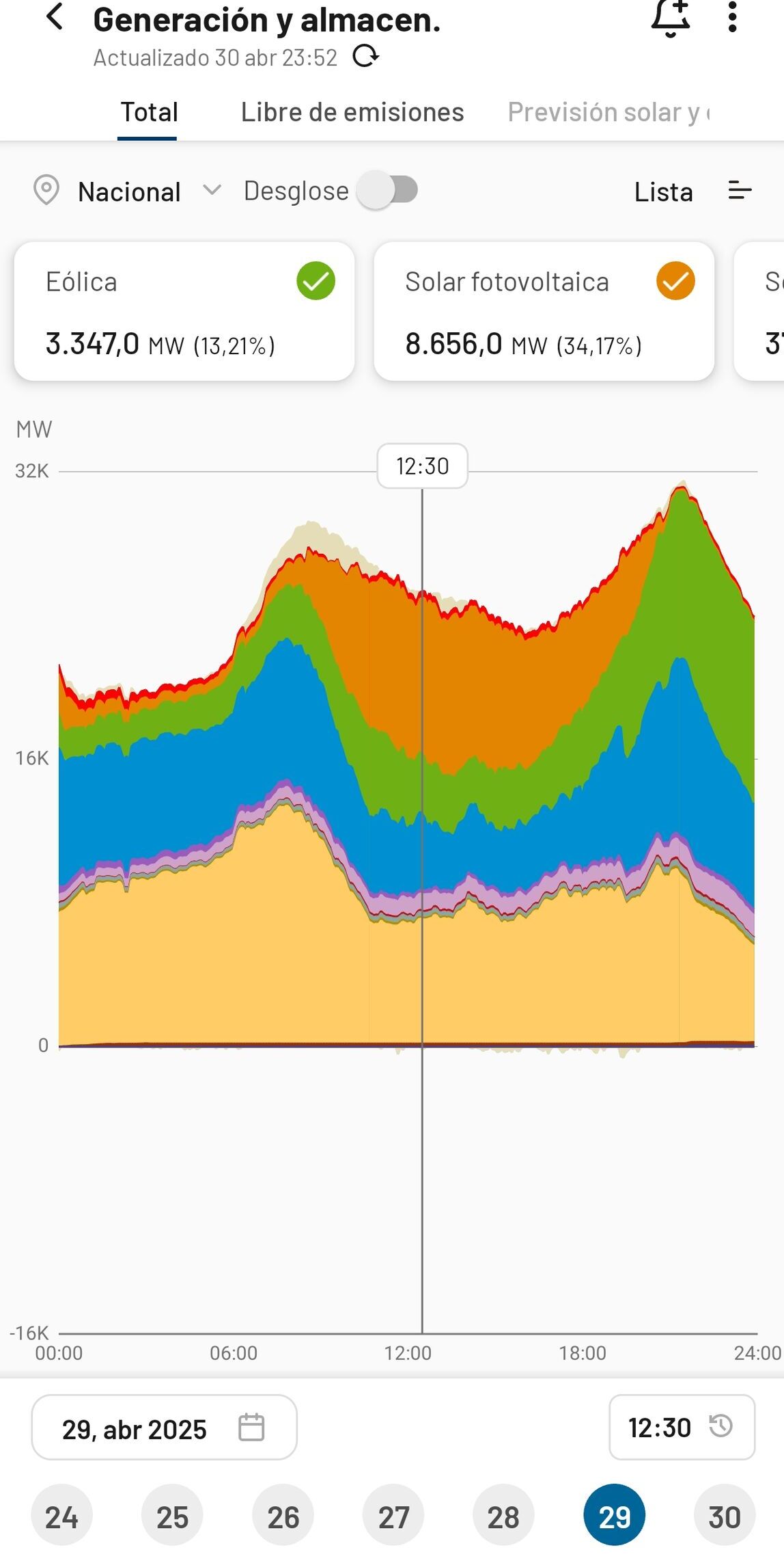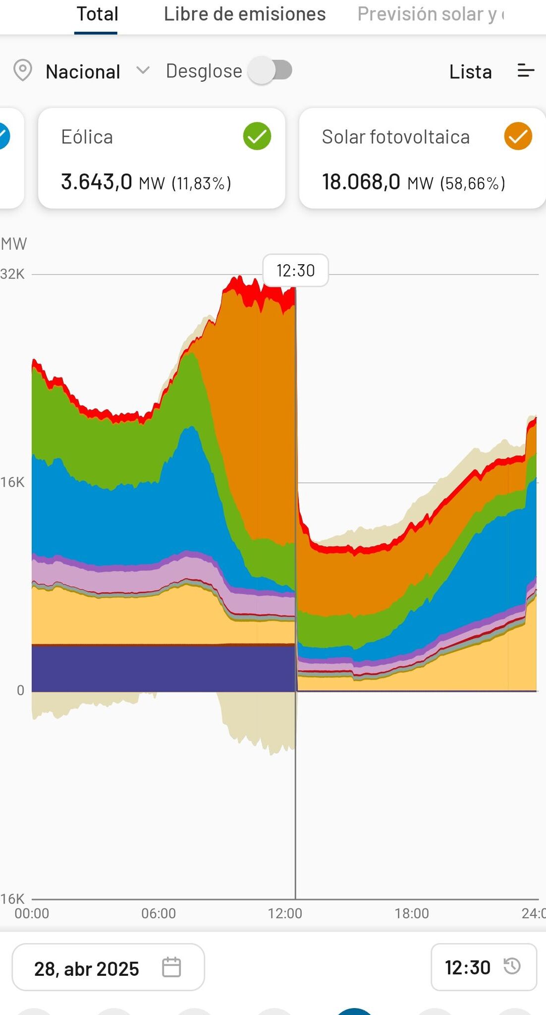 Sin embargo, a pesar del éxito pluvial, a las 12:30 del lunes, nuestro sistema apenas estaba usando el 0,42% de energía procedente del agua, mientras generaba más del 70% a través de fotovoltaica (58,66%) y eólica (11,83%).