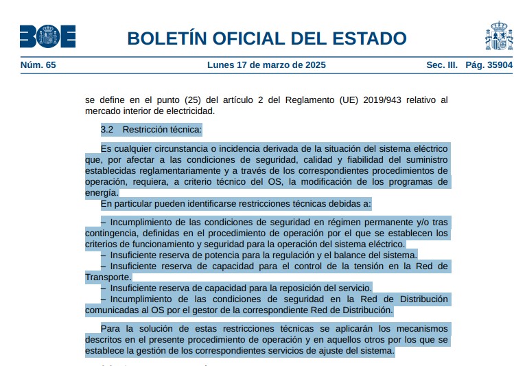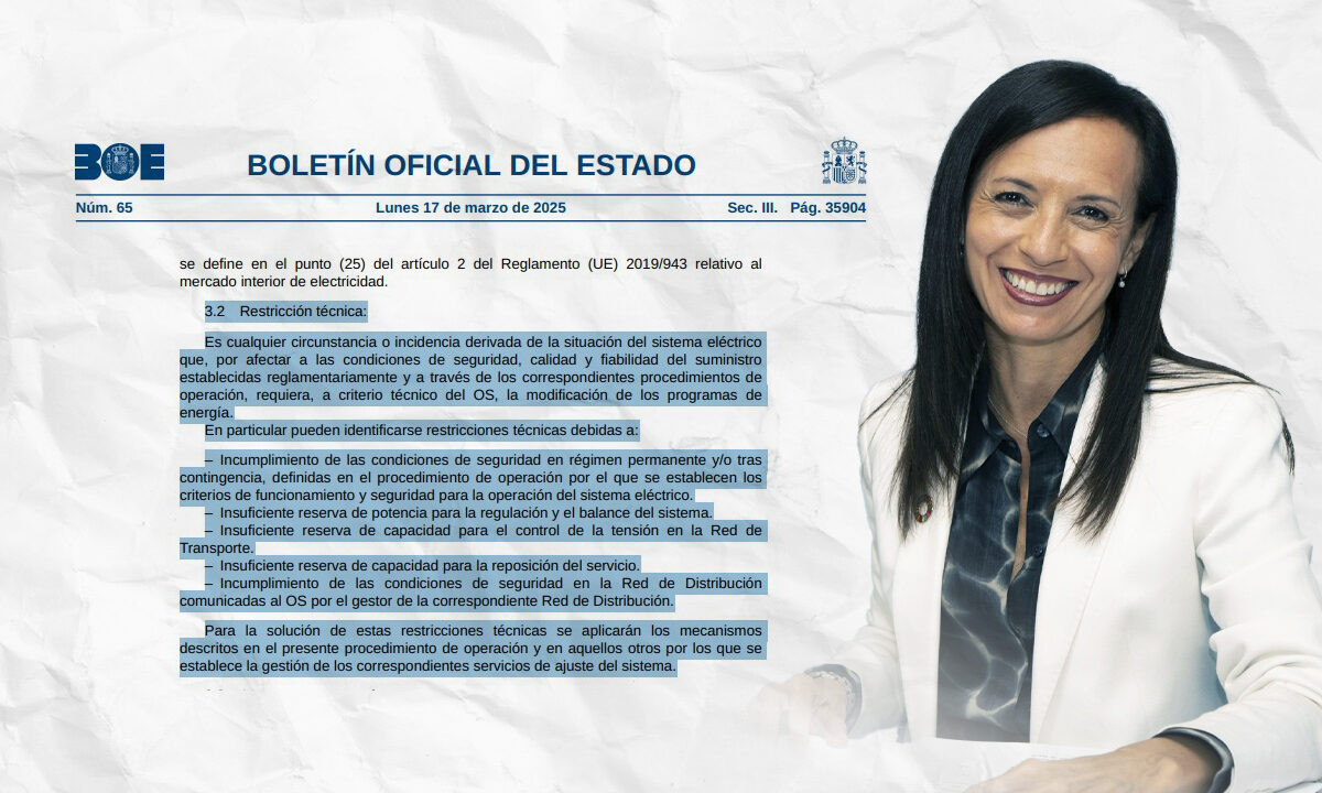 Para muestra, el Boletín Oficial del Estado. El pasado 17 de mazo, el BOE publicó "el proceso para la solución de las restricciones técnicas identificadas en el sistema eléctrico peninsular español en el Programa Diario Base de Funcionamiento (PDBF), así como las que puedan identificarse con posterioridad durante la operación en tiempo real".
