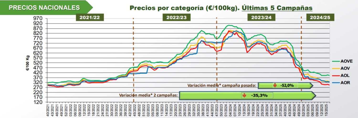 En concreto, actualmente 100 litros de aceite cuestan en promedio en origen 335,88 euros, frente a los 692,71 de 2024. Así, en origen 100 litros de aceite de oliva virgen extra cuestan 390,28 euros (lo cual supone una reducción del 48,8% en el últimos años y del 28,5% en los dos últimos años) y 100 litros de aceite de oliva virgen suponen 330,27 euros (reduciéndose un 52,3% en un año y un 36,8% en dos).
