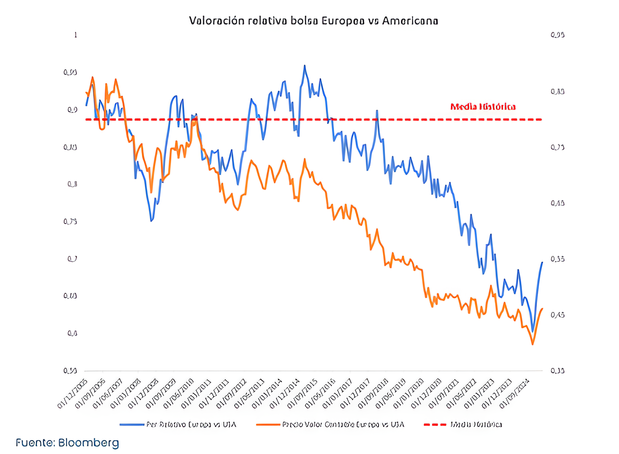 Y es que Europa, a día de hoy es estable y está muy barato. Vean cómo la valoración de las bolsas de EEUU con respecto a Europa, está muy barata para las europeas.