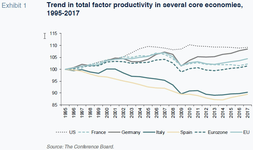 Según Funcas, en base a datos de The Conference Board, la productividad total de los factores en España desde 1995 hasta 2017 no sólo no creció sino que cayó un 10,5%, mientras que en la UE creció un 4,5%.