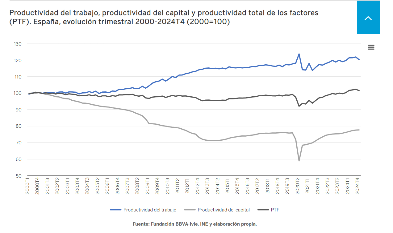 Como podemos ver en ambos gráficos, la productividad desde 1995 hasta el año 2014 no paró de caer, remontando muy ligeramente a partir de ese año y creciendo muy poco, hasta el punto de que se puede hablar de una productividad estancada. También podemos ver que mientras que la productividad del trabajo sí que ha crecido en España, no lo ha hecho así la productividad del capital, lo cual quiere decir que España necesita invertir mucho más en capital para que así los trabajadores puedan tener un mayor margen de incrementar su productividad por hora trabajada.