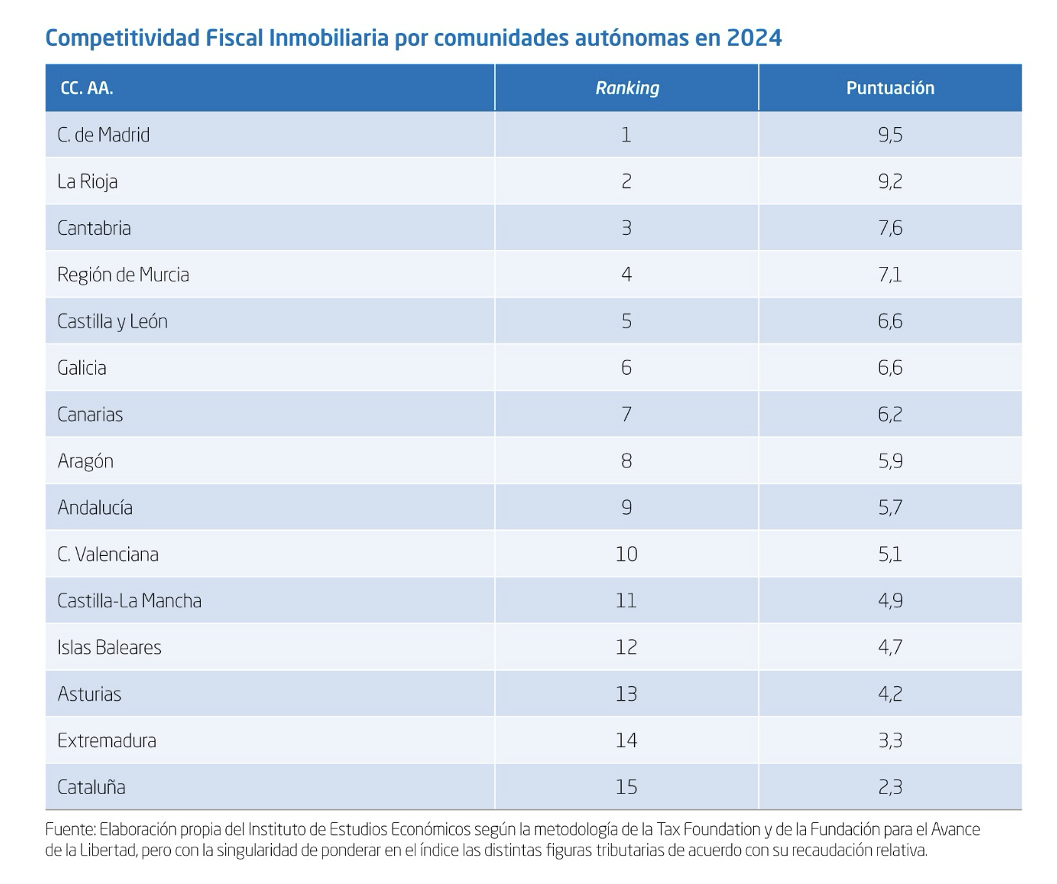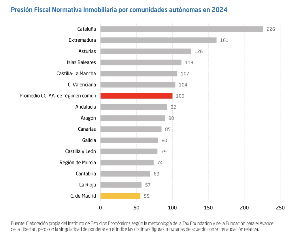 Comparando la presión normativa de la fiscalidad inmobiliaria, el IEE señala que Cataluña está 126 puntos por encima de la media autonómica, mientras que Madrid se sitúa 45 por debajo de dicho umbral.