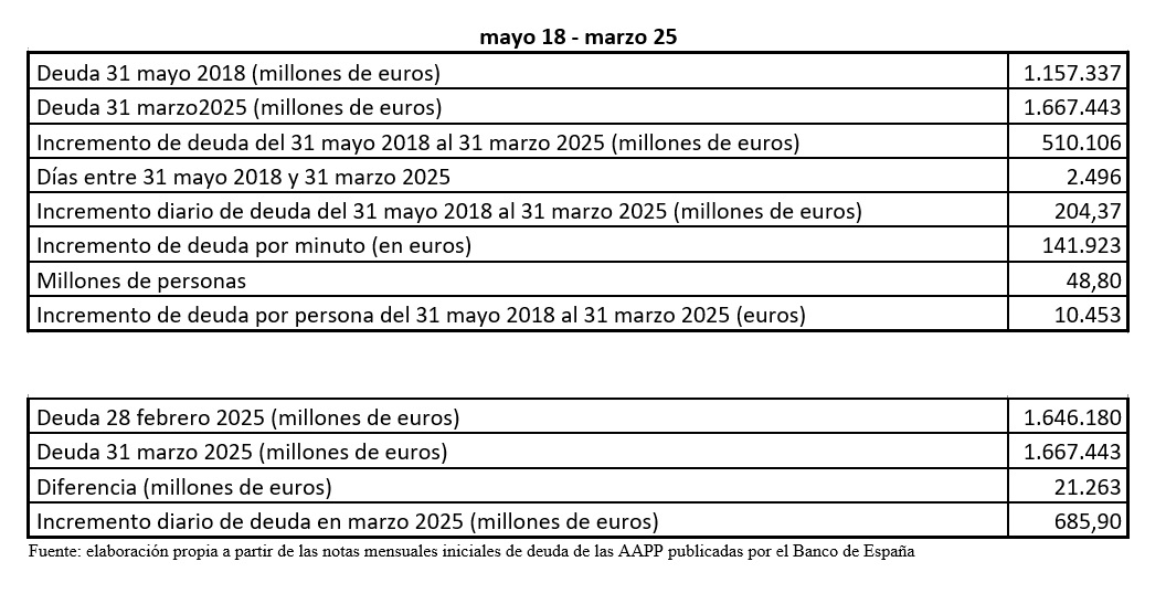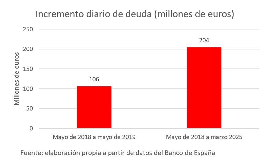 O visto de otra manera: en el primer año, la deuda se incrementaba a un ritmo de 105,99 millones de euros al día. Ahora, tras casi siete años de Gobierno de Sánchez, la deuda crece 204,37 millones de euros cada día.