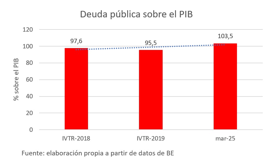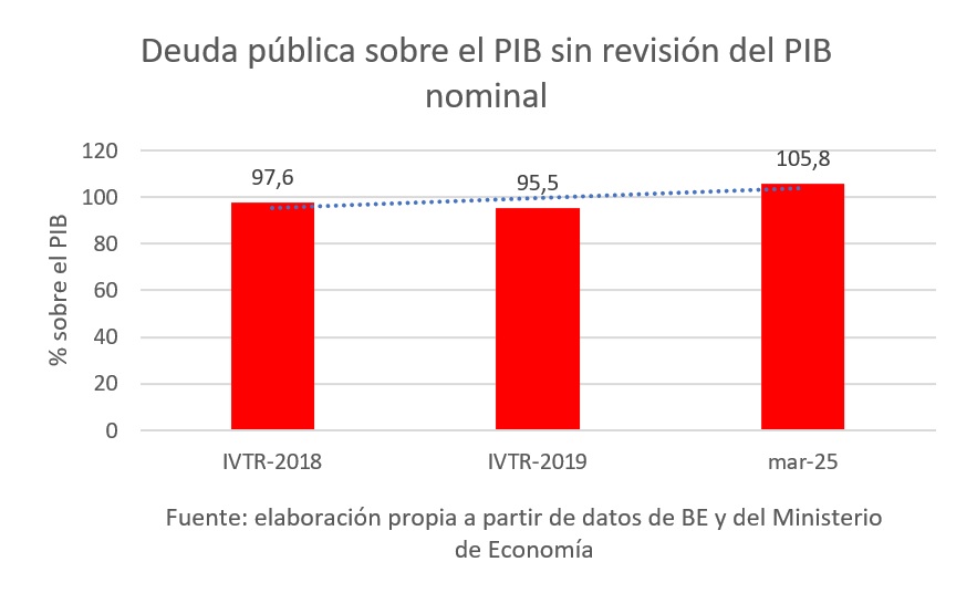 Sin esa revisión, sería del 101% del PIB. Es decir, la revisión extraordinaria del PIB rebaja en más de 2 puntos el cociente, pero la deuda sube con fuerza en valores absolutos: