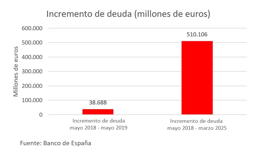 Todo ello, nos lleva a que desde que gobierna Sánchez la deuda se ha incrementado en 510.106 millones de euros. Durante el primer año, aumentó en 38.688 millones, y al cabo de seis años y medio de mandato el incremento es de 510.000 millones de euros, según las notas mensuales iniciales publicadas por el Banco de España sobre la deuda de las AAPP.