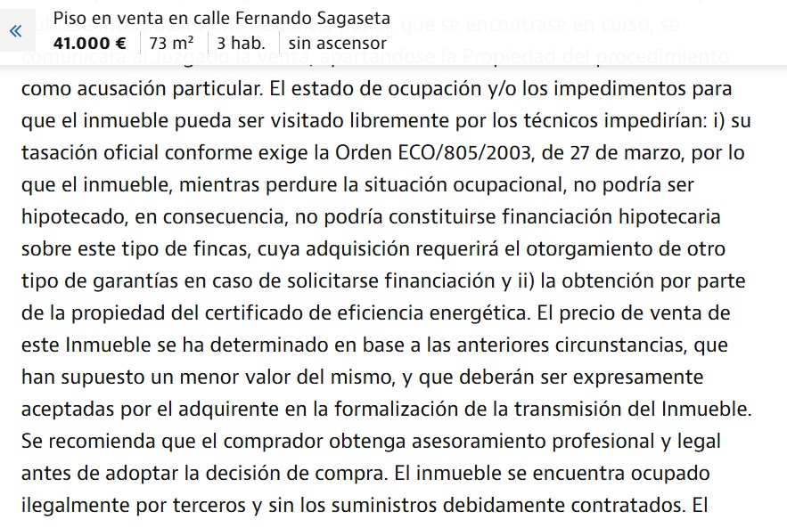 Así las cosas, las advertencias copan todos los anuncios. "Inmueble ocupado, no visitable", subraya uno de los miles que cualquiera puede encontrar a golpe de clic. "El inmueble se encuentra ocupado ilegalmente por terceros y sin los suministros debidamente contratados", informa otro, aunque son las inmobiliarias de los bancos las que más se explayan a la hora de alertar de los riesgos.