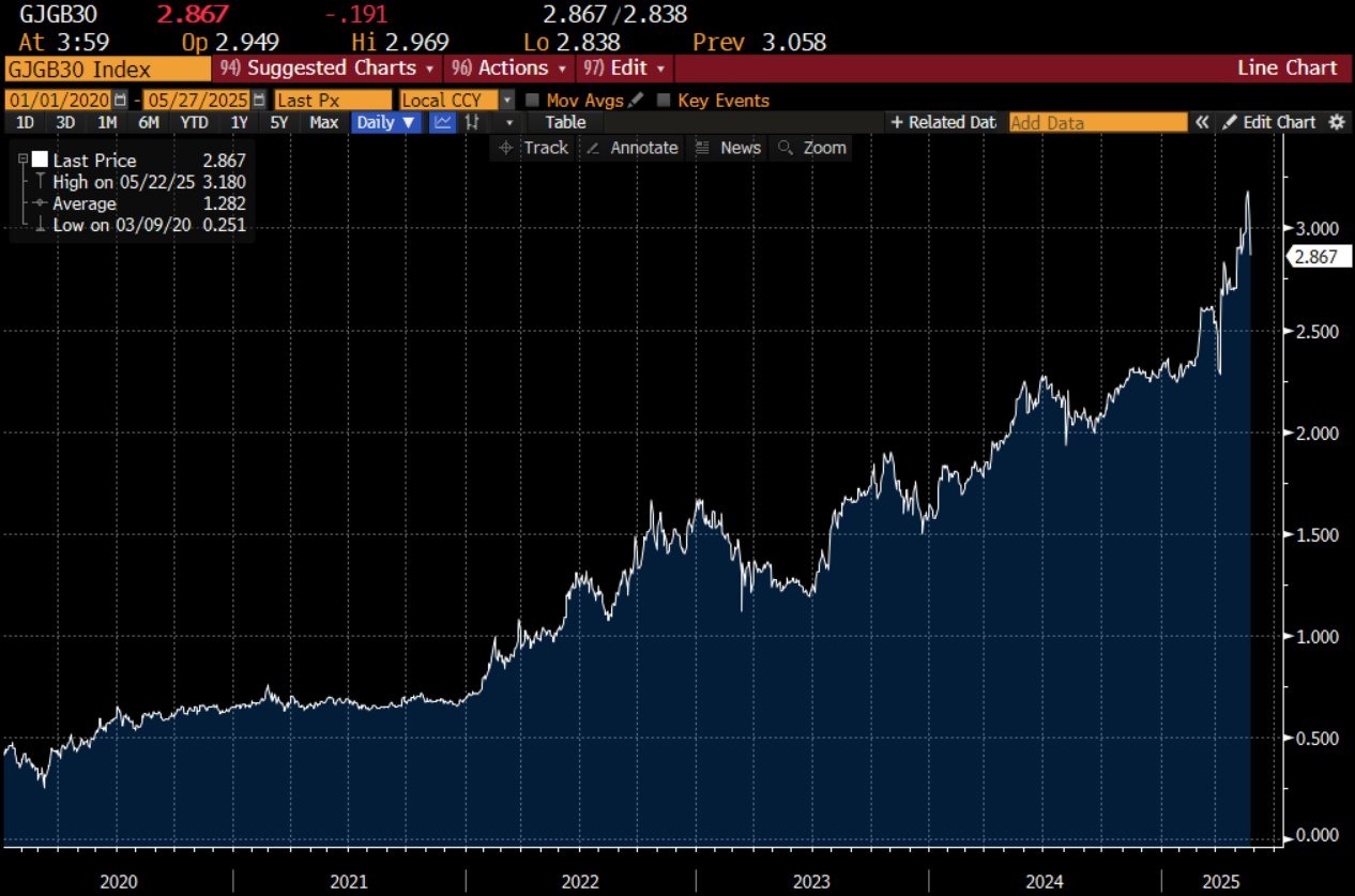 La semana pasada, los rendimientos a 30 años se dispararon a sus niveles más altos en 25 años tras una subasta de bonos muy débil, llegando a alcanzar un máximo del 3,19% el 22 de mayo, aunque desde entonces ha sufrido una caída y se ha colocado en 2,91%.