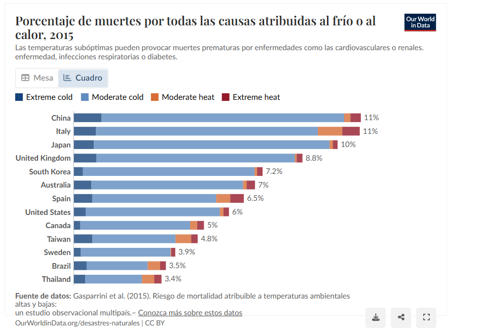 Aunque quizás pueda sorprender al lector, en todo el mundo mueren muchas más personas debido al frío que al calor, y esto ocurre desde China hasta Estados Unidos, así como en España. Así lo podemos ver en el siguiente gráfico proporcionado por Our World In Data.