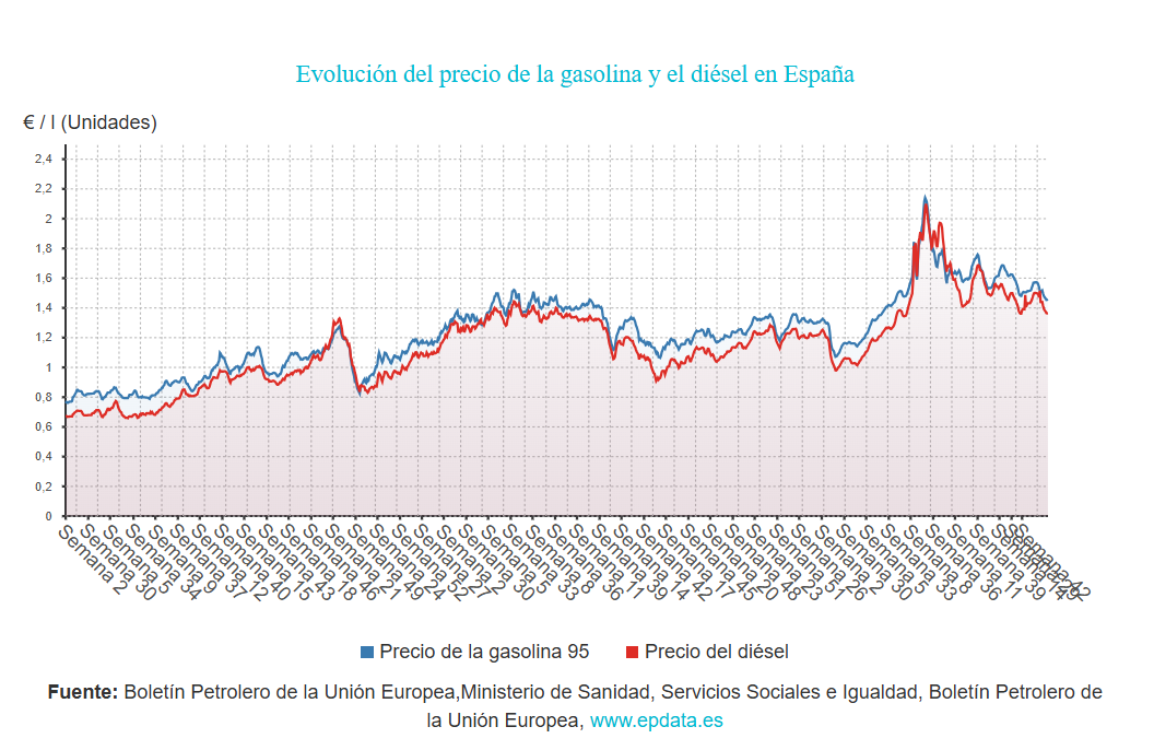 Como decimos, ya desde mediados del año 2022 se viene produciendo una caída sostenida en los precios de los dos combustibles más utilizados en nuestro país, cuando llegaron a alcanzar los precios más altos vistos hasta la fecha, siendo el precio de la gasolina de 2,14 euros el litro y el del diésel de 2,08 euros el litro. A partir de entonces, estos precios han ido disminuyendo hasta encontrarnos con los precios actuales de 1,46 euros el litro para la gasolina y de 1,37 euros el litro para el gasóleo. En el siguiente gráfico podemos ver la evolución:
