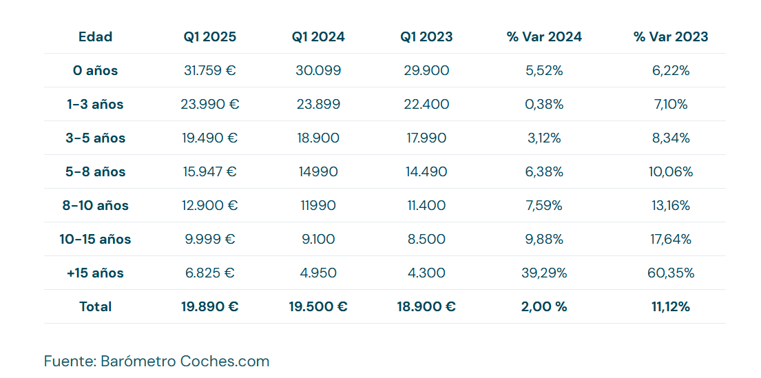 Si observamos los datos que nos ofrece el último Barómetro de Coches.com, que hace referencia a los datos del primer trimestre del año 2025, podremos ver la evolución que ha habido en los precios de cada tipo de coche (según la edad de este) desde el primer trimestre del año 2023 hasta el primer trimestre de 2025.