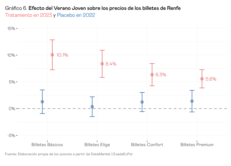 "Los resultados de las regresiones indican que la tasa de ocupación de asientos de tipo básico fue casi un 4,9% superior en los trenes tratados por la política en comparación con los trenes de control, un resultado estadísticamente significativo y robusto. En la misma época de 2022 (cuando no había descuento) se observó un incremento del 1,2%. Con ello, el efecto total atribuible a la bonificación podría quedarse en alrededor del 3,7%."