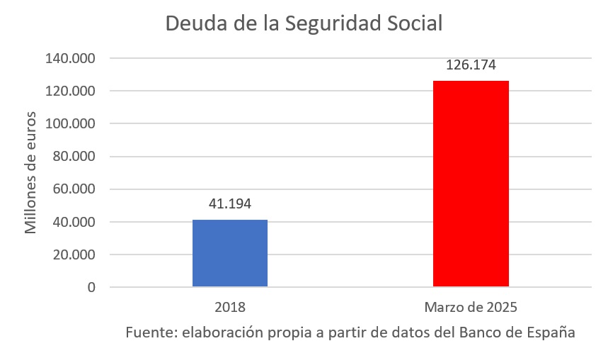 Además, la aportación de los 2.793,2 millones al fondo de reserva de 2023 viene cubierta por el préstamo del Estado, que sirve para cubrir dicha aportación, la pequeña diferencia entre el resto de operaciones de ingresos y gastos y el déficit no financiero. En 2024, las aportaciones elevarán el fondo a 8.356 millones de euros en euros corrientes en la llamada hucha de las pensiones, pero si cuando se creó con Aznar era ahorro real, porque la Seguridad Social se encontraba en superávit, ahora es falso, pues el ahorro se debe a un artificio contable. Ahora, esa hucha es una hucha desfondada, rellenada gracias a préstamos, no a verdadero ahorro. Y esa deuda, Sánchez la eleva en alrededor de 75.000 millones de euros desde que gobierna. Los datos del último mes disponible no hacen sino confirmar este desfondamiento: así, pasamos de una deuda de la Seguridad Social de 41.194 millones en 2018 a otra de 126.174 millones en el último dato publicado, marzo de 2025.