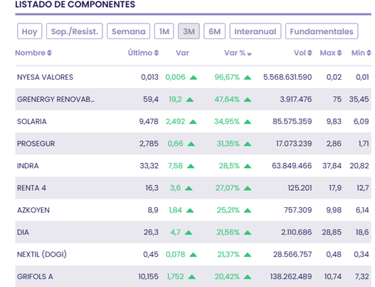 Pueden ver entre los valores que más han subido, muchos de ellos cumplen estas premisas. Si miramos los diez valores ganadores en este periodo de tiempo, vemos cómo Nyesa, Grenergy, Solaria, Prosegur o Indra superan el 28% de rentabilidad.
