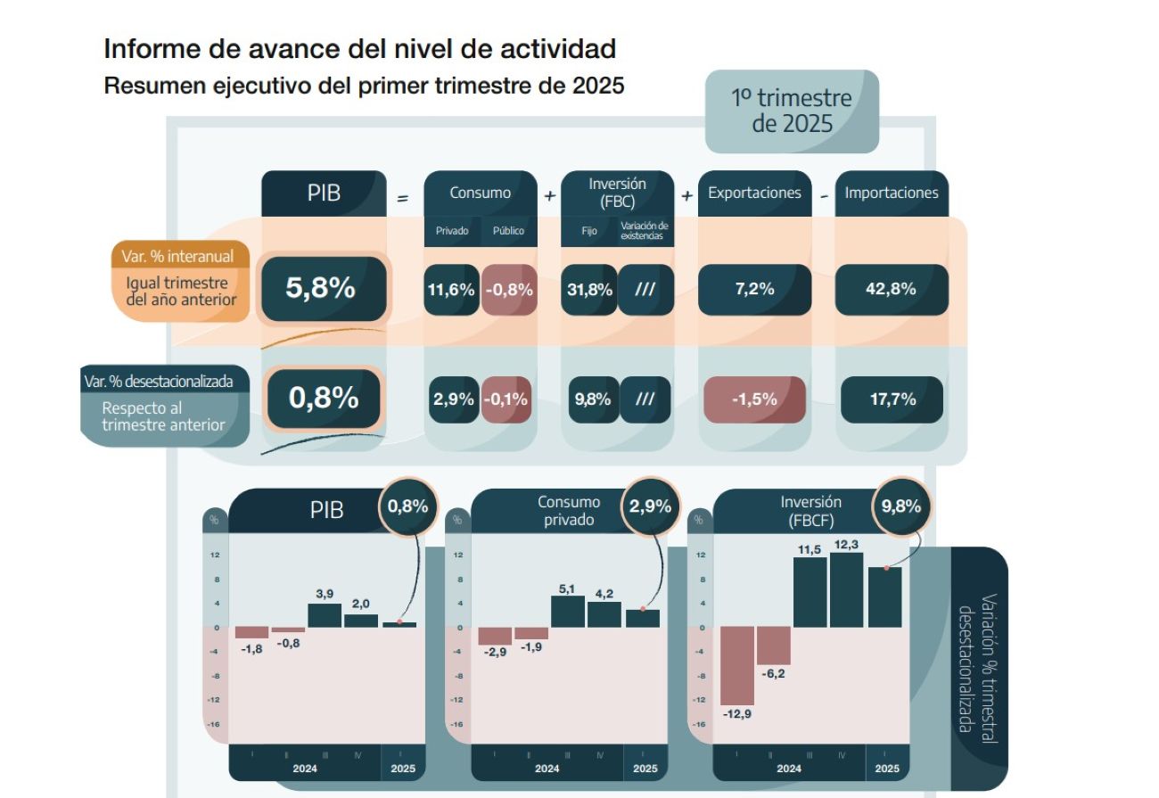 Así las cosas, el inicio del 2025 ha resultado igualmente positivo para la evolución de la economía argentina, puesto que durante el primer trimestre del año el PIB creció 0,8% (en términos desestacionalizados) respecto al cuarto trimestre del año anterior. Así lo confirma el INDEC, que añade que "la serie original del PIB, en comparación con igual período del año anterior, mostró un crecimiento de 5,8% en el primer trimestre del año", por lo que el país encadena tres trimestres de crecimiento.