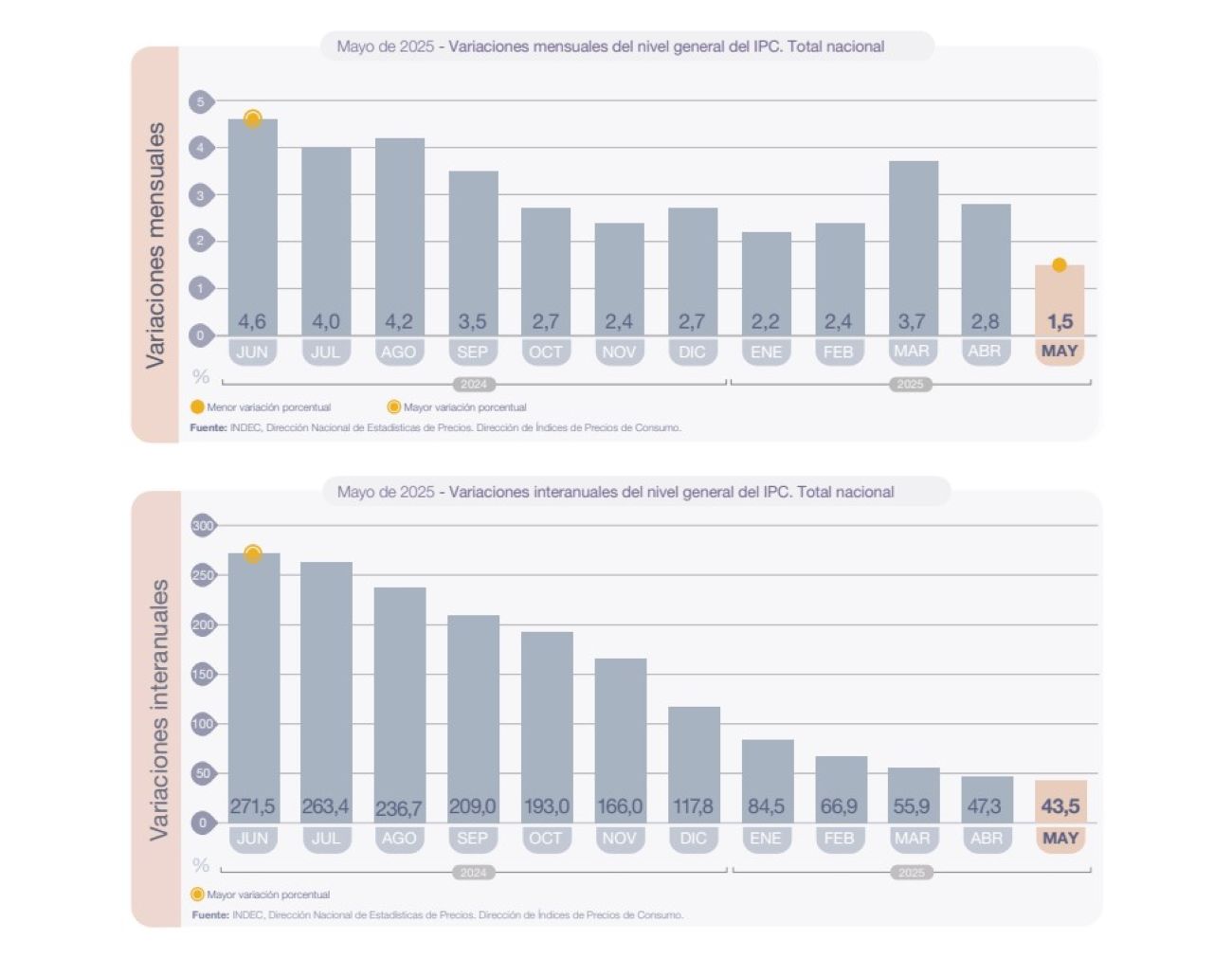 Con todo, el factor que ha favorecido en mayor medida la mejora de las condiciones de vida en Argentina ha sido el control de la inflación. De acuerdo con el INDEC, en mayo de 2025 la inflación mensual se situó en el 1,5%. Del mismo modo, en términos anuales, pese a seguir siendo una tasa demasiado elevada, la evolución de los precios refleja significativa hasta el 43,5%.