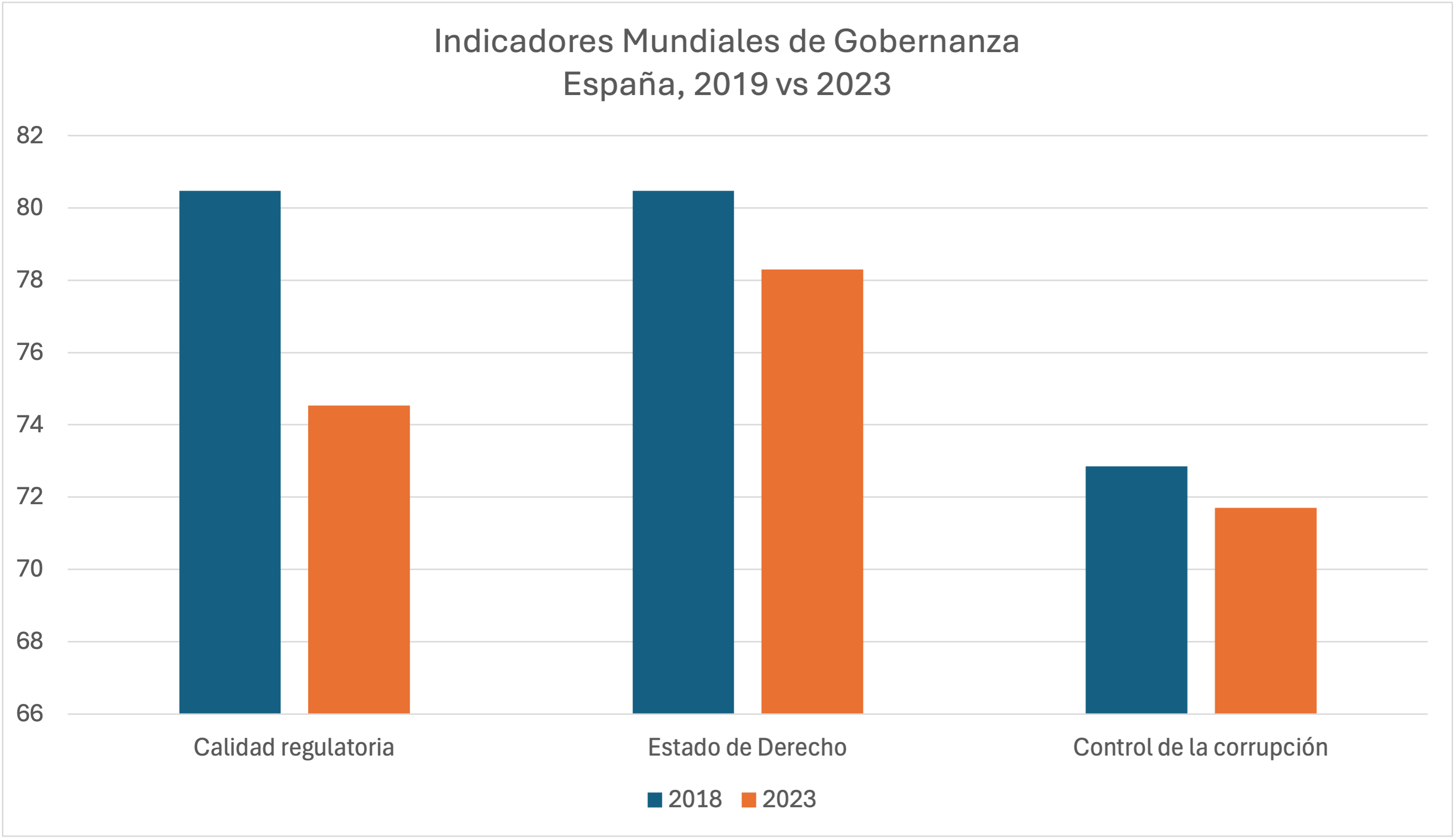 Esta misma deriva viene reflejada en los World Governance Indicators del Banco Mundial, que miden seis pilares referidos al concepto de buen gobierno. España retrocede en todos ellos: desde la calidad regulatoria hasta el Estado de Derecho, pasando por el control de la corrupción. En este último apartado, nuestro país ha perdido más de 15 puntos porcentuales en la última década, situándose ya por debajo de la media de la OCDE.