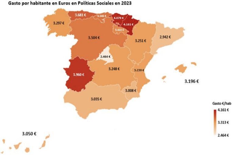 Navarra es la comunidad autónoma que más gasta por habitante en políticas sociales, según la Asociación Estatal de Directoras y Gerentes de Servicios Sociales. El último informe de la entidad revela que el gobierno foral destinó en 2023 un total de 4.161 euros por persona a sanidad, educación y servicios sociales. Esta cifra casi duplica los 2.464 euros por habitante que invierte la Comunidad de Madrid, que cierra la tabla y se consolida como el territorio con menos gasto en políticas sociales en términos per cápita.