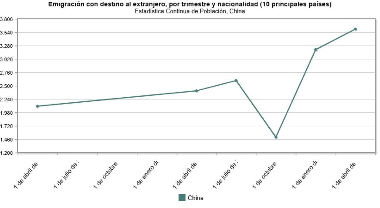 Ahora son los chinos los que parecen escapar de nuestro país buscando un lugar mejor en el que desarrollar sus vidas. Como demuestran los datos proporcionados en su Estadística Continua de Población por el INE, entre enero de 2025 y abril de 2025, el número de chinos que han emigrado desde España ha aumentado un 12,5%. Así, desde octubre de 2025 (cuando se produjo un descenso contrario a la tendencia registrada) este incremento ha sido del 140%. Con todo, en tasa anual este aumento ha sido del 50%.