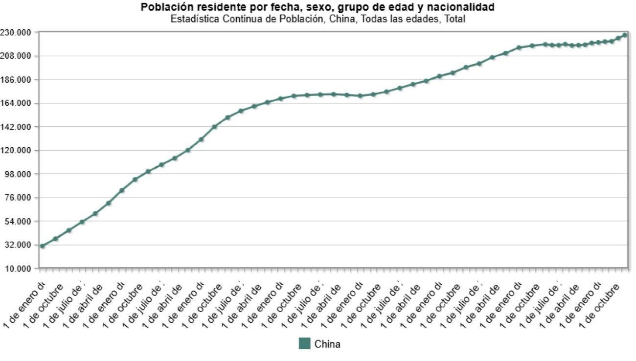 No obstante, es cierto que la población total de residentes chinos en España sigue creciendo. El propio INE muestra que la cantidad de residentes de nacionalidad china así lo atestigua, si bien la tendencia es, del mismo modo, hacia la desaceleración. A continuación, podemos comprobar que, mientras que de enero de 2016 a enero de 2020 los residentes chinos en España aumentaron un 18,%, entre enero de 2020 y enero de 2024 se incrementaron apenas en un 5,4%.