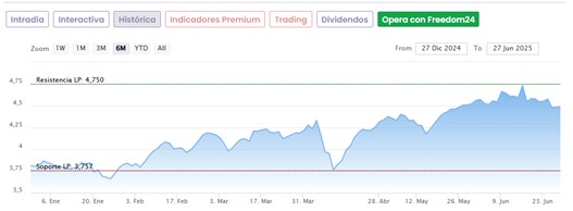 Para el analista Roberto Moro, "Telefónica se está enfrentando a una resistencia muy importante, una zona que ya actuó como freno durante buena parte de 2019. De hecho, estamos hablando de niveles que no se veían desde entonces, lo cual es muy significativo. En estos momentos, el valor ha superado con claridad el 50% de retroceso de Fibonacci de toda la caída desde sus máximos históricos, que fueron en torno a los 6,80 euros —hablando de gráficos ajustados por dividendos—. El siguiente objetivo técnico, que me parece razonable y alcanzable en el corto plazo, está en los 4,90 euros. Por tanto, sigue siendo, en mi opinión, una de las mejores opciones dentro del Ibex 35 en estos momentos.