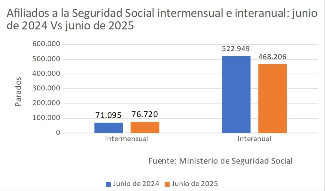 Del mismo modo, el dato intermensual de afiliación a la Seguridad Social sube en 76.720 afiliados, pero si se desestacionaliza la subida se queda sólo en 40.399, un 52,66% del total. El aumento de afiliación es impulsado interanualmente por Madrid, con 94.904 afiliados más y por Andalucía, con 81.486 afiliados nuevos. Por su parte, el dato interanual es el tercero peor de los últimos once años en un mes de junio.