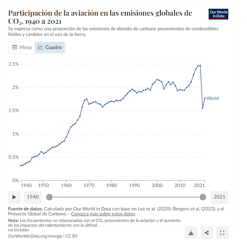 En primer lugar, tenemos que ver cuanto contaminan realmente los aviones, ya sean vuelos comerciales o vuelos privados. De acuerdo con Our World in Data, podemos ver que la participación de la aviación en las emisiones globales de 1940 a 2021 ha sido la siguiente: