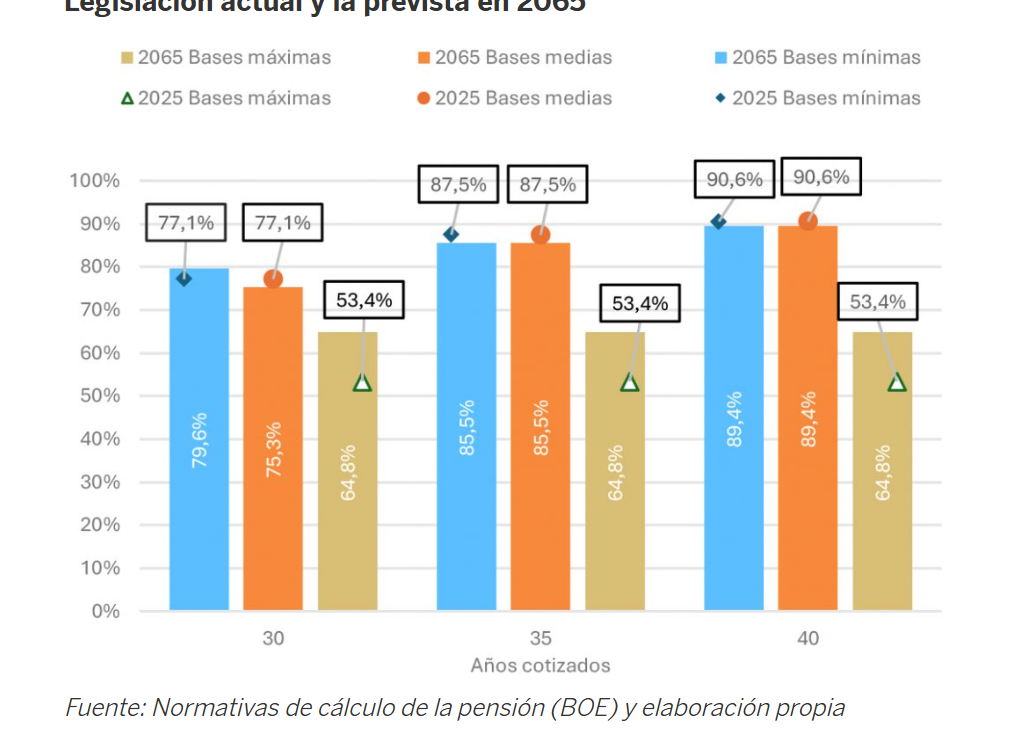 En la tabla anterior se observa que "con la legislación prevista actualmente, proyectada a 2065, hay una tasa bruta de reemplazo del 90% (que equivale aproximadamente a una tasa neta del 100%, lo que significa mantener el nivel de vida previo) con 40 o más años cotizados y con una edad de jubilación de 65 años. Para conseguir la misma tasa de reemplazo con una carrera laboral de 35 años se deberá demorar la jubilación hasta los 68 años, y hasta los 71 años con sólo 30 años cotizados". También resulta llamativa la baja tasa de reemplazo de las pensiones más altas, que son las que le corresponderían a los trabajadores que más ganan (y que más han cotizado).