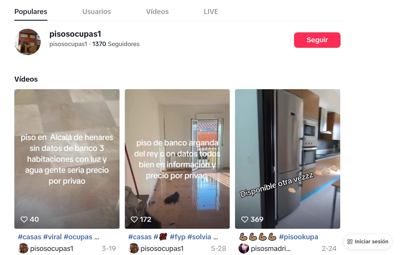 A la lentitud de la Justicia para atajar todos estos casos se suma, además, la pasividad ante aquellos que promueven la okupación de pisos vacíos, ya sea a través de talleres vecinales —cuando no academias perfectamente localizadas—, portales de anuncios o redes sociales. Y, entre ellas, TikTok empieza a consolidarse ya como la favorita, a tenor del interminable historial de vídeos que cualquiera puede encontrar con una simple búsqueda.