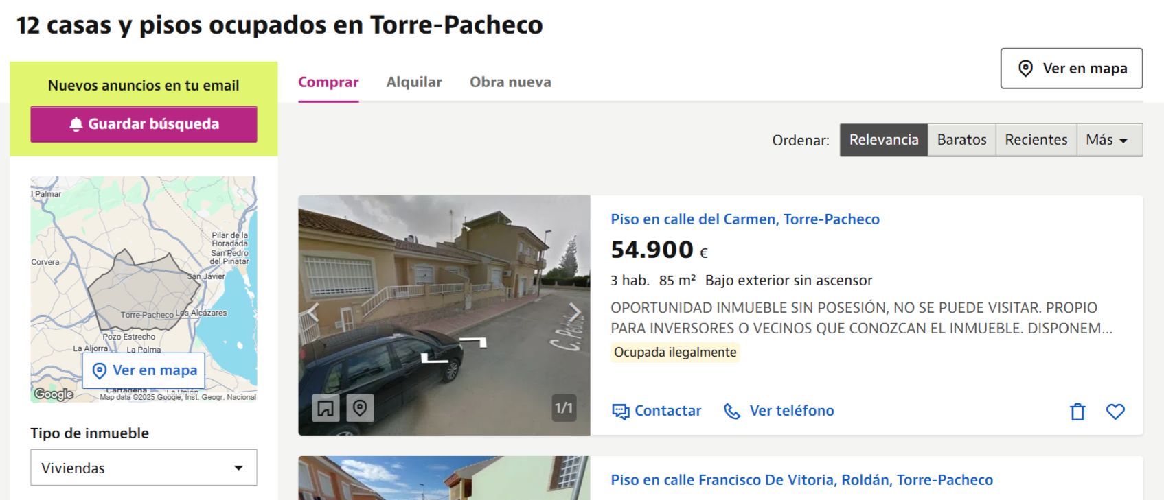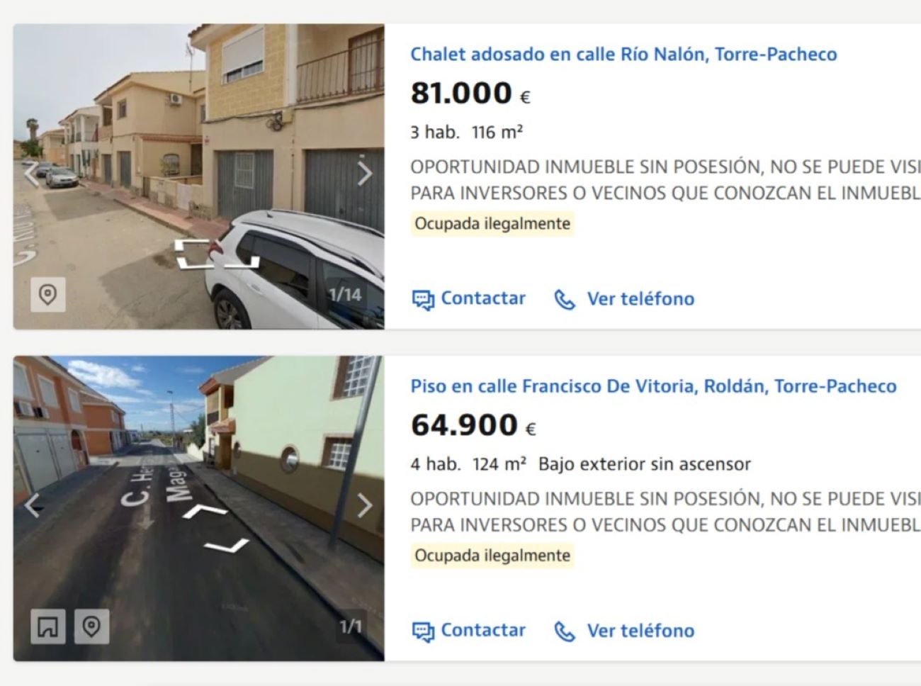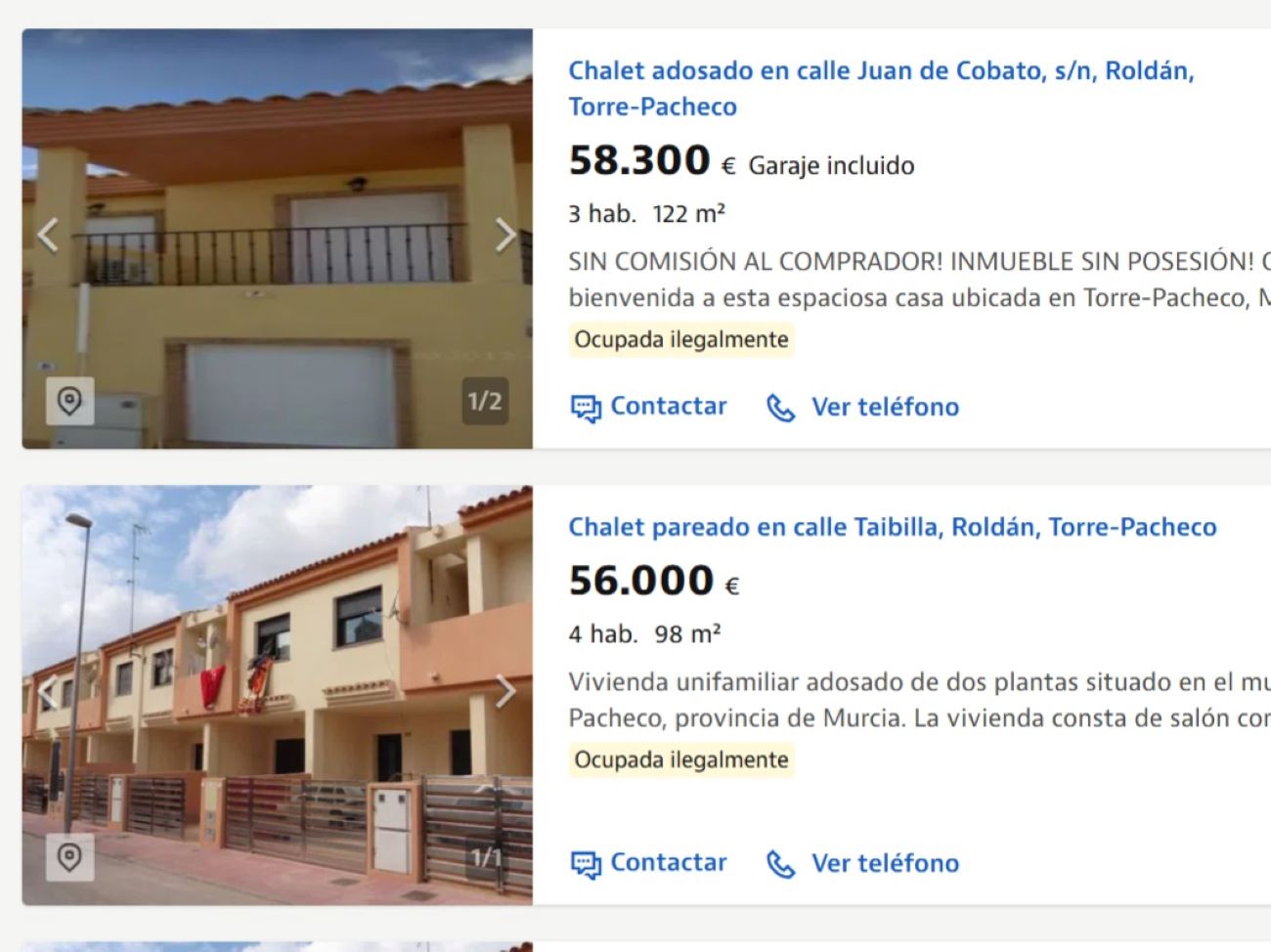 De este modo, vemos que en el caso de este municipio murciano hay al menos doce inmuebles okupados a la venta. Precisamente por ello, los precios de estos inmuebles son más reducidos, puesto que quienes inviertan en estas viviendas tendrán que hacer frente a costes adicionales, tanto por la reforma necesaria como por el proceso judicial que tendrán que llevar a cabo para expulsar a los okupas. De hecho, por este motivo en todos estos anuncios se detalla que estos inmuebles son oportunidades para los inversores, dados los grandes costes que implica la okupación y porque un particular que desee residir en estas viviendas no podrá hacerlo mientras estas personas permanezcan allí.