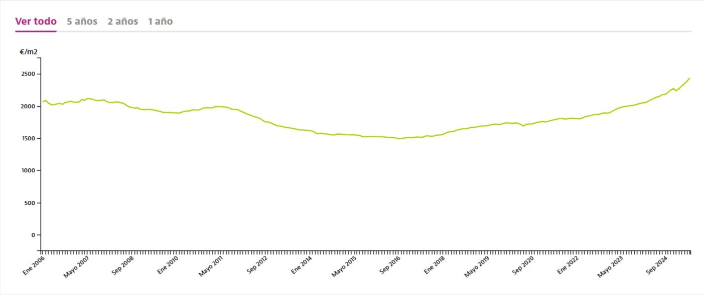 Esta desprotección que sufren los propietarios, así como las restricciones impuestas sobre la iniciativa privada en el mercado inmobiliario, están disparando los precios de la vivienda en nuestro país. De acuerdo con los datos ofrecidos por Idealista sobre la evolución del precio de la vivienda en venta en España correspondientes al mes de junio, el precio del metro cuadrado se sitúa en los 2.438 euros. Esto implica un incremento del 2% frente al mes de mayo. Así las cosas, en términos anuales el precio de la vivienda en venta ha crecido en nuestro país un 14%. En comparación con enero de 2019, este incremento ha sido del 45,7%.