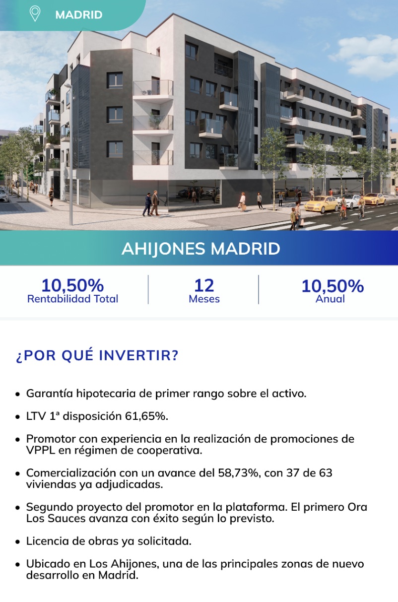Te presentamos el proyecto Ahijones Madrid. Esta oportunidad trata de la concesión de un préstamo con garantía hipotecaria de primer rango para financiar parte de la compra del suelo y parte de los soft costs. Es un préstamo puente para el desarrollo de un edificio residencial plurifamiliar de 63 viviendas VPPL con garajes y trastero en régimen de cooperativa por parte del grupo ORA GESTIÓN.