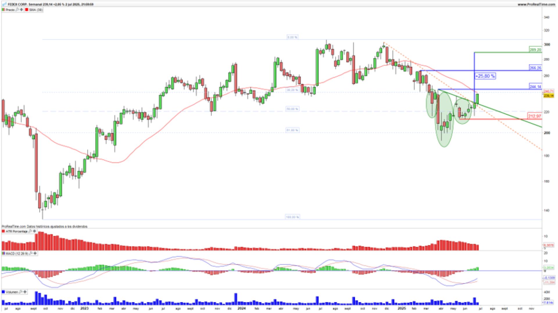 De este modo, la formación de esta figura chartista se ha desarrollado sobre los niveles de Fibonacci de toda la subida producida desde octubre del año 2022, por lo que el activo se encuentra consolidado a largo plazo, aumentando con ello las probabilidades de asistir a avances en el precio durante las próximas semanas, por lo que mantendremos la actitud muy positiva para las acciones de Fedex mientras no asistamos a un precio de cierre semanal por debajo de los 212,97$ por acción.