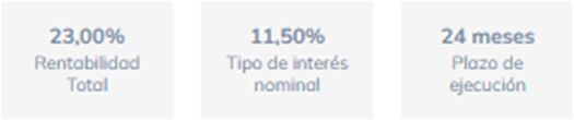 El ticket del proyecto a financiar es de 4.500.000€ con una rentabilidad total del 23% (11,50% TIN), en un plazo de 24 meses, con posibilidad de amortización anticipada a partir del mes 9.