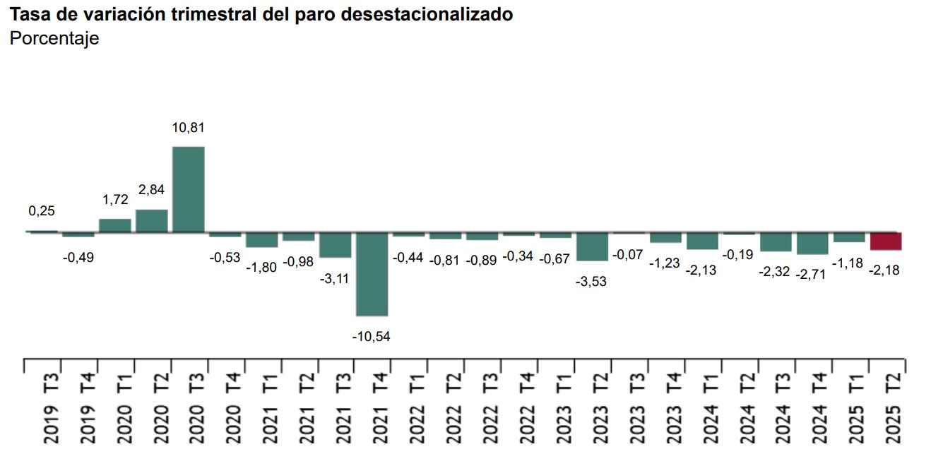 El empleo masculino sube en 265.800 personas y el femenino en 237.500 personas. Sube en todos los sectores: en servicios lo hace en 364.800 personas, ligado a actividades turísticas directas e indirectas; industria (90.300); construcción (45.400); y agricultura (2.800). El paro baja en 236.100 personas en términos intertrimestrales. Además, al desestacionalizar es la segunda peor de los últimos cuatro trimestres.