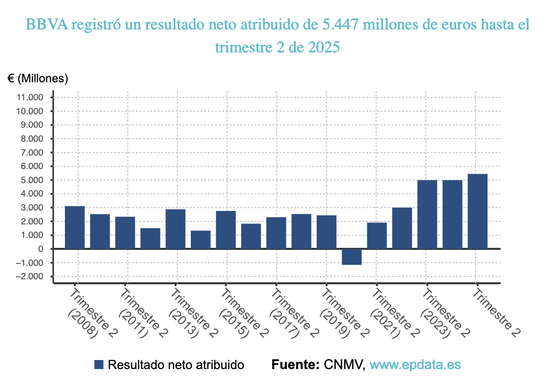 BBVA consiguió un beneficio neto atribuido récord de 5.447 millones de euros en el primer semestre del año, un 9,1% más frente al mismo periodo de 2024, gracias al dinamismo de la actividad en España y México, según ha informado este jueves a la Comisión Nacional del Mercado de Valores(CNMV).