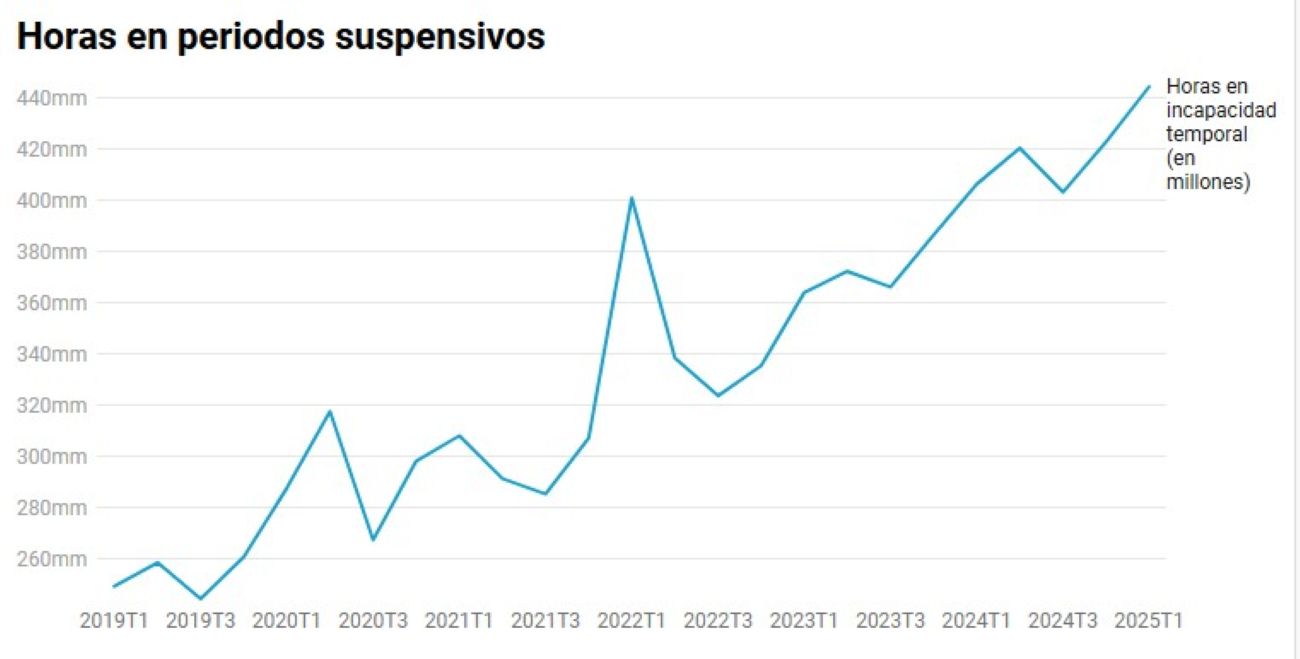 Sin embargo, el triunfalismo del Gobierno en materia laboral queda diluido si tenemos en cuenta que, dentro del número total de horas cotizadas, también aumenta el total de horas no trabajadas por incapacidad temporal también se han disparado en este mismo período. Es más, aumenta también el total de horas en períodos suspensivos, puesto que si en el primer trimestre de 2025 sumaron 510 millones, en el último trimestre de 2019 se situaron en 308 millones. Del mismo modo, en el primer trimestre de 2019 éstas sumaron 293 millones. Por tanto, el incremento fue del 65,6%% con respecto al cuatro trimestre del año 2019 y del 74% en relación con el primer trimestre de 2019.
