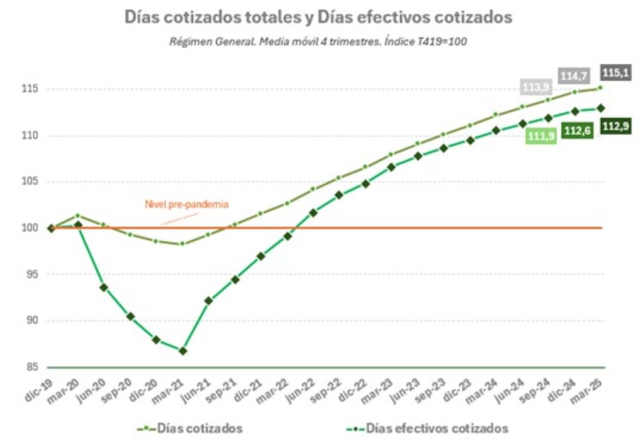 De hecho, aunque el Ministerio, que acaba de publicar las estadísticas de de días cotizados y de horas efectivas trabajadas, se felicite de que "los días efectivos trabajados aumentan un 12,9% desde el nivel previo a la pandemia y las horas cotizadas lo hacen un 12,3% en el primer trimestre de 2025", no puede sino admitir que "para tener una visión real de la situación del mercado laboral, hay que descontar del cálculo de los días cotizados por los afiliados: los días en ERTE, las incapacidades temporales y otras prestaciones (nacimiento y cuidado de menor, riesgo durante el embarazo y durante la lactancia natural)".