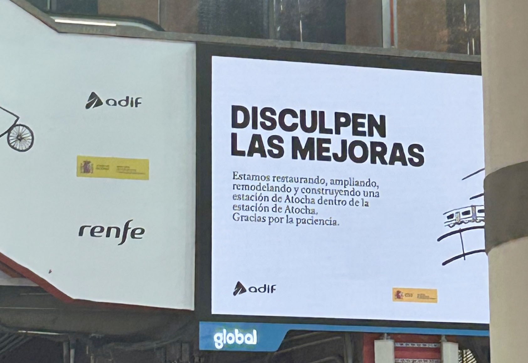 El cartel de Renfe dice así: "Disculpen las mejoras. Estamos restaurando, ampliando, remodelando y construyendo una estación de Atocha dentro de la estación de Atocha. Gracias por la paciencia", ha sido interpretado como un insulto más que como una explicación ante la situación de caos en los trenes y estaciones.