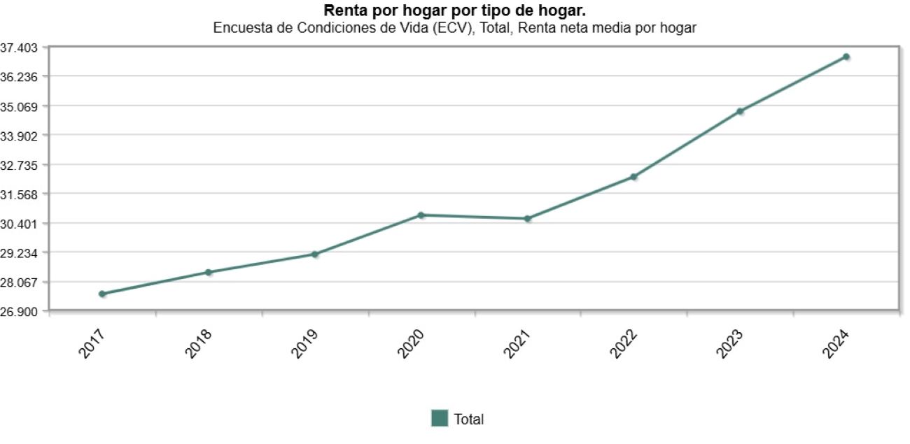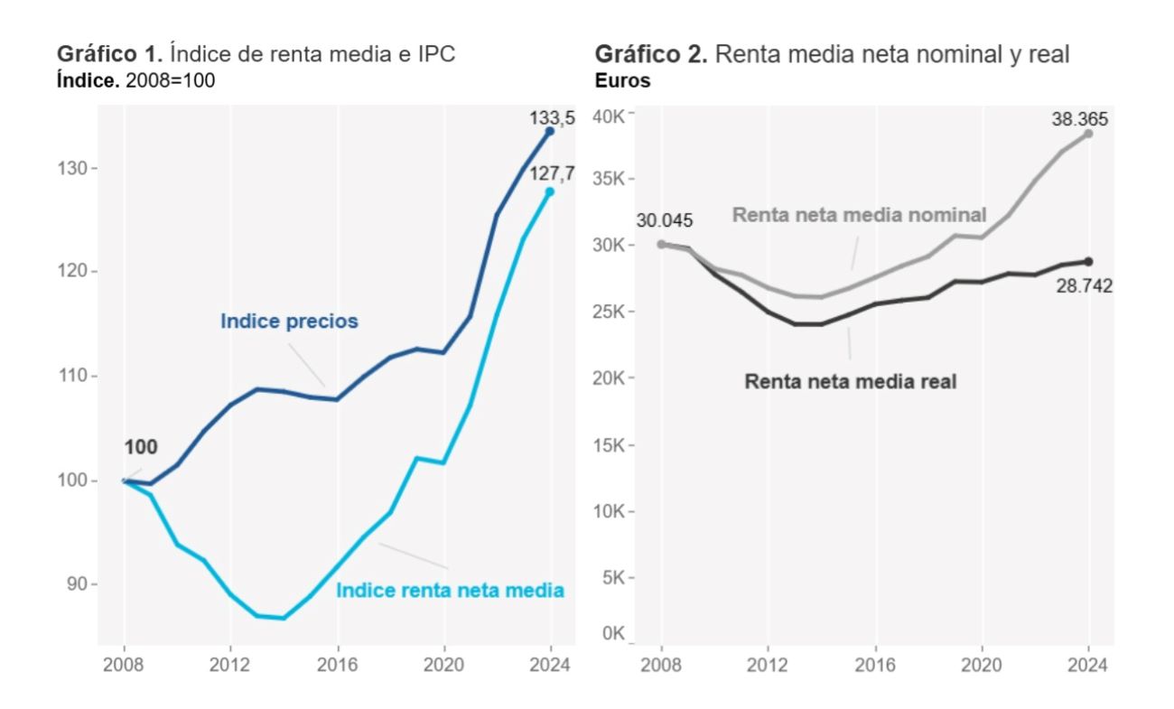Como vemos, tras el impacto de la crisis financiera de 2008, el crecimiento de la renta real de los españoles comenzó en el año 2013, experimentando el mayor repunte entre 2014 y 2019, cuando se incrementó un 13,4%. Posteriormente, entre 2019 y 2024 esta subida ha sido del 5,4%.