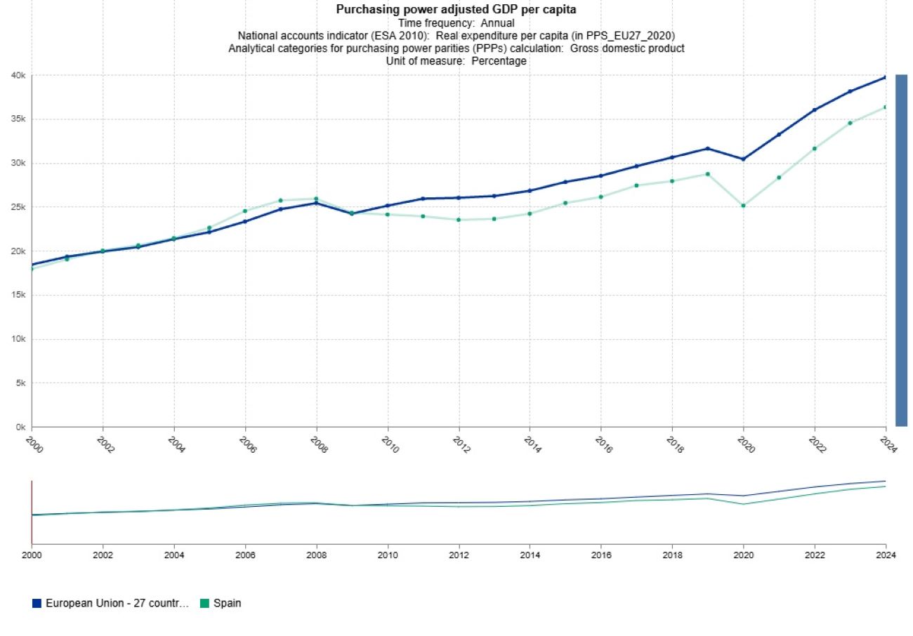 Con todo, estos no fueron los únicos ‘errores’ cometidos por Sánchez al hablar sobre la evolución de la renta y la capacidad de compra de los españoles. También afirmó que entre España y la UE había existido "históricamente" una brecha en términos de renta que ahora, gracias a su Gobierno, se estaba reduciendo. Pero, una vez más, la realidad difiere notablemente de las palabras del presidente. Como podemos comprobar a continuación, de acuerdo con los datos ofrecidos por Eurostat, entre el año 2002 y el año 2009 el PIB per cápita español fue superior a la media de la UE, y ya desde el año 2010 permaneció por debajo.