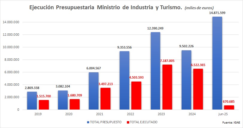 Comparando el presupuesto vs. ejecutado (en miles de euros) se observa la dimensión del problema. El presupuesto de 2025 se dispara hasta 14.871.599.000 euros, en parte por remanentes de ejercicios anteriores, pero a junio apenas se han ejecutado 670 millones. Es imposible que exista una mínima credibilidad, desde proyectos industriales a programas de modernización de pymes. Cuando el sector privado observa que el Estado no convierte los créditos en pagos, descuenta retrasos y eleva su prima de riesgo administrativa.