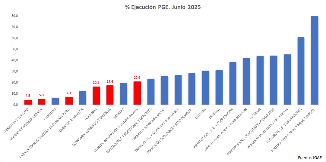 Donde importa, no se ejecuta, los ministerios con mayor capacidad tractora presentan unos datos de ejecución pírricos. Industria y Turismo (4,5%), Vivienda y Agenda Urbana (5,3%) y Transformación Digital y Función Pública (7,1%). No debería sorprendernos, cuando el Estado expande su intervencionismo y sólo se dedica a la propaganda, pero no invierte en capacidad de gestión, el cuello de botella aparece donde más daño hace: en la inversión pública que debía impulsar productividad, vivienda y digitalización.