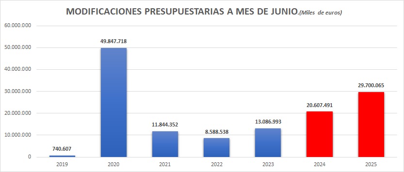 Comparando las modificaciones presupuestarias a junio, salvando la anomalía de 2020 explicada por la pandemia, muestra como las prórrogas presupuestarias han creado una nueva patología: con presupuestos prorrogados, el Gobierno se apoya en incorporaciones, transferencias y suplementos para reconstruir el marco de gasto sobre la marcha de forma opaca y sin control.
