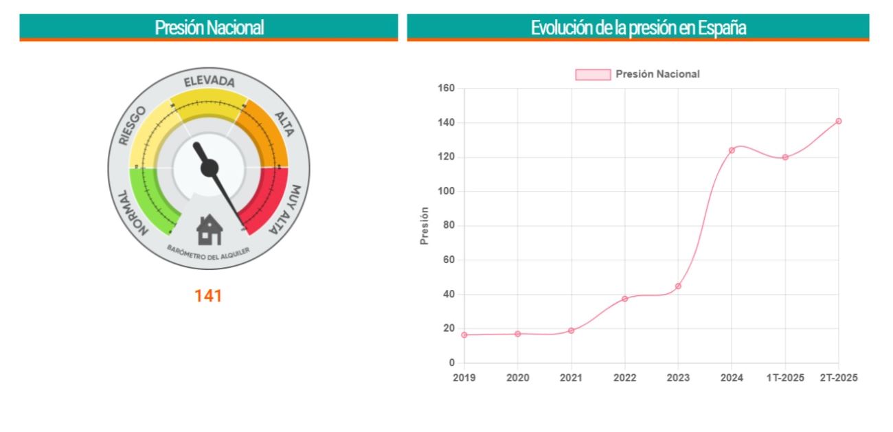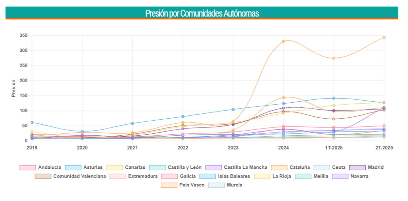 Como consecuencia, la presión sobre el mercado del alquiler ha alcanzado un punto crítico. Como podemos apreciar a continuación, el alza de la presión de este mercado se produjo especialmente a partir del año 2023, tras la entrada en vigor de la Ley de la Vivienda en mayo de ese año. Así, la presión en este mercado ha crecido un 214,73% entre el año 2023 y el segundo trimestre de 2025. Este incremento ha sido del 759,75% desde 2019.