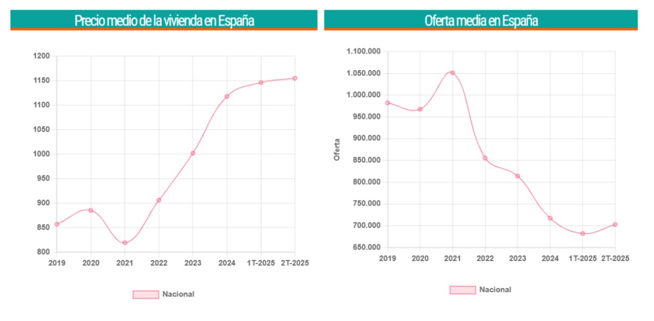 En este sentido, el precio medio de la vivienda en España ha aumentado un 15,27% a nivel nacional desde 2023 y un 34,77% desde el año 2019. Por su parte, la oferta media en España ha registrado una caída del 13,64% entre 2023 y el segundo trimestre de 2025 y un 28,44% desde 2019.
