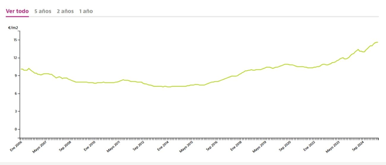 Del mismo modo, como podemos ver a continuación. el precio de la vivienda en alquiler alcanzó los 14,6 euros por metro cuadrado en julio de 2025. Así, se ha disparado casi un 11% en tasa anual y un 46% desde enero de 2019.
