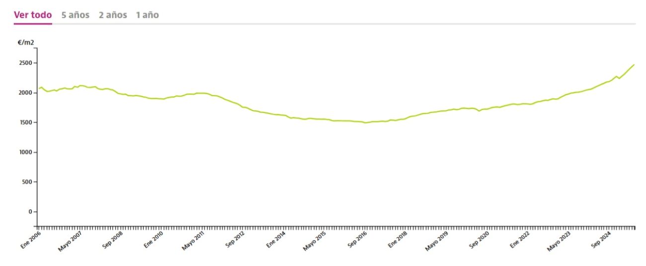 Así, el precio de la vivienda en venta en España se situó el pasado mes de julio en los 2.471 euros por metro cuadrado, incrementándose un 14,7% con respecto a julio del año anterior. De hecho, desde enero de 2019 este incremento ha sido del 47,7%.